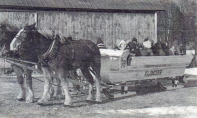 The family originally scheduled the ride on a branch of O’Neill Creek; unfortunately, warm weather caused the breakup of ice. The Klondike sleigh was a familiar part of the Neillsville scene during the 1930s. George Tibbett and his brother, Jack Tibbett, established the Ice and Fuel Company. As the business grew, George Tibbett purchased the bob-sled-style sleigh from his grandfather, Jacob Gehweiler, of Chippewa Falls in 1932.