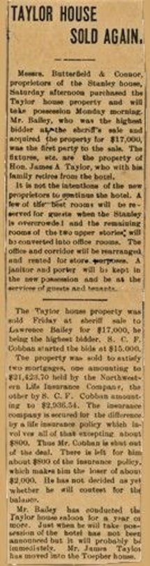 TAYLOR HOUSE SOLD AGAIN Messrs. Butterfield & Connor, proprietors of the Stanley house, Saturday afternoon purchased the Taylor house property and will take possession Monday morning. Mr. Bailey, who was the highest bidder at the sheriff’s sale and acquired the property for $17,000, was the first party to the sale. The fixtures, etc. are the property of Hon. James A. Taylor, who with his family retires from the hotel. It is not the intentions of the new proprietors to continue the hotel. A few of the best rooms will be reserved for guests when the Stanley is overcrowded and the remaining rooms of the two upper stories will be converted into office rooms. The office and corridor will be rearranged and rented for store purposes. A janitor and porter will be kept in the new possession and be at the services of guests and tenants. _______________________________ The Taylor house property was sold Friday at sheriff sale to Lawrence Bailey for $17,000, he being the highest bidder, S.C.F. Cobban started the bids at $15,000. The property was sold to satisfy two mortgages, one amounting to $21,423.70 held by the Northwestern Life Insurance Company, the other by S.C.F. Cobban amounting to $2,936.54. The insurance company is secured for the difference by a life insurance policy which involves all of that excepting about $800. Thus Mr. Cobban is shut out of the deal. There is left for him about $800 of the insurance policy, which makes him the loser of about $2,000. He has not decided as yet whether he will contest for the balance. Mr. Bailey has conducted the Taylor house saloon for a year or more. Just when he will take possession of the hotel has not been announced but it will probably be immediately. Jr. James Taylor has moved into the Toepher house.