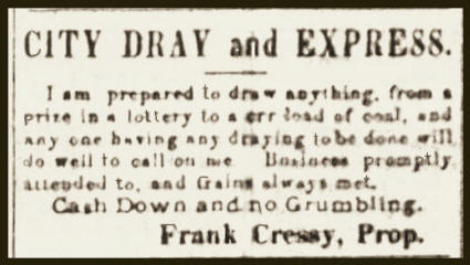 FRANK ran an express and dray service which he called the "Knickerbocker Transfer Line" out of an office in his wagon. He ran an advertisement September 22, 1882 in the Spencer paper which read: Baggage and freight transferred in scientific principles. All train met - orders filled on Sundays. Only line in city that gets there by day. He also said, "Cash down - no grumbling." Another advertisement read: I am prepared to draw anything from a prize tottery to a carload of coal. Anyone having any draying to do will do well to call on me. Business attended to promptly. He sold the business in 1883 to Emery Urich.