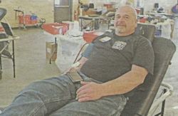 Volunteer firefighter Bill Poeschel relaxes while donating double reds during