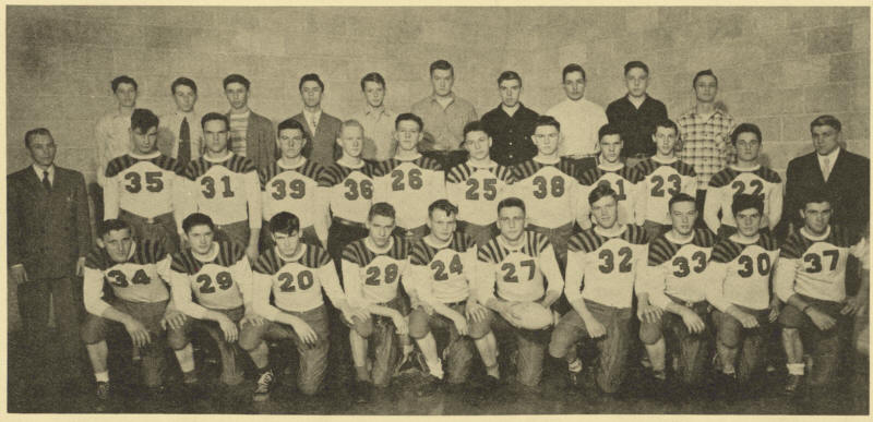 Lloyd Horn, Gary Speich MIDDLE ROW: Coach Thompson, Darrell Horn (35), Harold Miller (31), Donald Schwarze (39), Gerald Horn (36), Jack Rondorf (26), DuWayne Carl (25), Harvey Goeke (38), Robert Unger (21), Edward Buker (23), Joe O'Black (22), Assistant Coach Panzenhagen FRONT ROW: Charles Klapatauskas (34), Donald Decker (29), Kenton Stewart (20), Robert Bruce (28), Gary Corey (24), Harland Carl (27), Everett Gorsegner (32), Bill Niemi (33), George Plunkett (30), Robert Daines (37) |