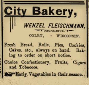 Wenzel Fleischmann, the new baker, arrived Monday, and took possession of the Becherer Bakery. He comes recommended as a first-class baker from the quality of bread, rolls, etc., turned out at the first baking, we thinks the recommend speaks right. Colby Phonograph, 1 Jul 1897