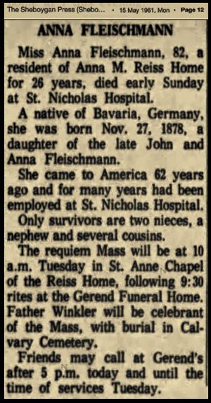 In 1930, Anna Fleischman was fifty-one years old working at the St. Nicholas Hospital in Sheboygan, Wis. as a maid. In 1950, she was seventy-one years old and an inmate at the Anna Reiss Home for the aged in Sheboygan, Wisconsin. She died at that same home 14 May 1961 at the age of eighty-two.