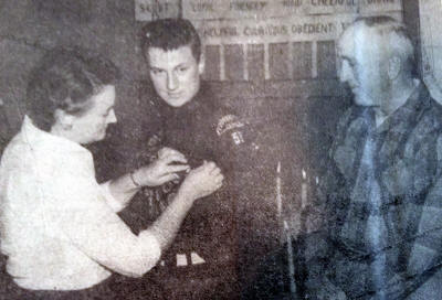 Schneider is shown pinning the Eagle pin on Tom. Looking on is Mr. Schneider.