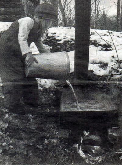 This young lady pours maple sap into a large pan that is boiled over a wood fire