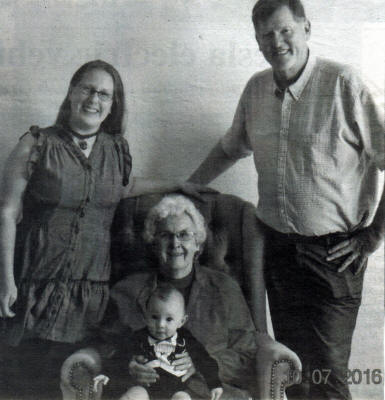 The Thompson family recently gathered together for this four-generation photo. Pictured (l-r) are Rebecca Clifton (mother) of Denton, TX; Ann Thompson (great-grandmother) of Marshfield, formerly of Neillsville, holding baby Norman Clifton; and Clyde Thompson (grandfather) of New Orlean, LA. (Contributed photo)