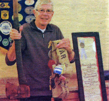 Neillsville Kiwanis Club President Bob Solberg displays the coveted axe,