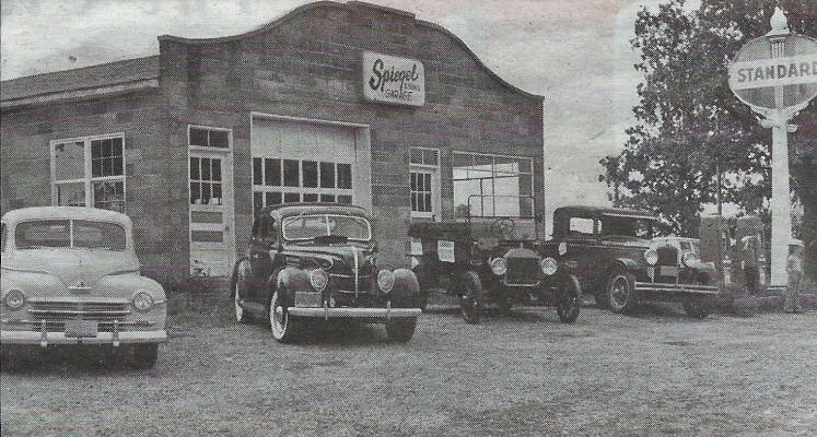 The Spiegel Garage is shown circa 1975 with cars parked in front that