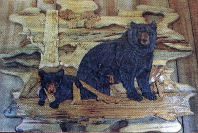 A wood carving of bears in nature is among the bear-related memorabilia in David