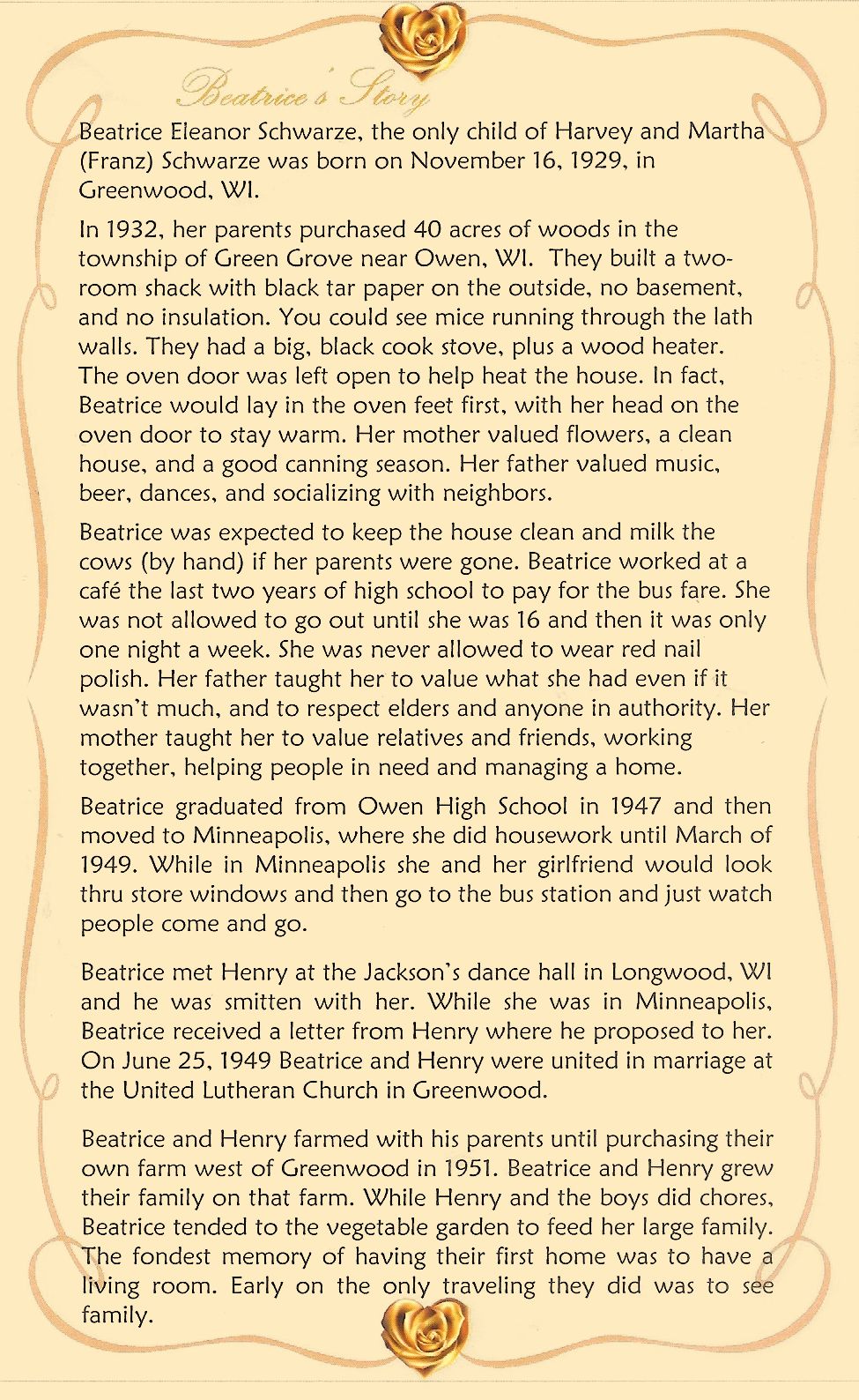 Born November 16, 1929 to Harvey and Martha (Franz) Schwarze at farm