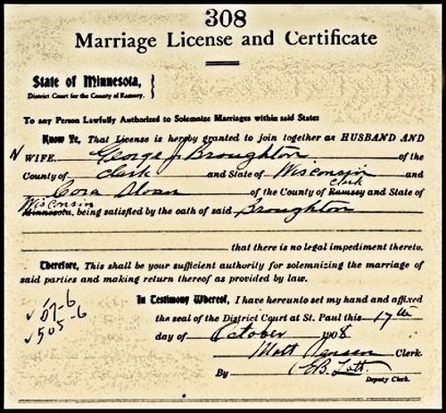 Marriage of George Julius Broughton and Cora Sloan, 17 Oct 1908