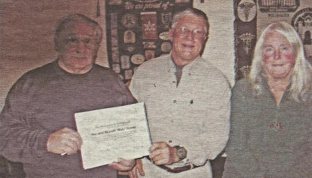 certificate to Ewing, with his wife Sue standing by. Contributed photo