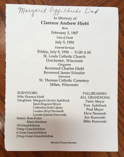 Obit: Hiebl, Clarence Andrew (1907 - 1994)