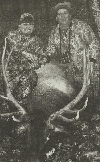 James Orlowski (l) and Rick Jensen pose with the bull elk Orlowski shot Oct. 31