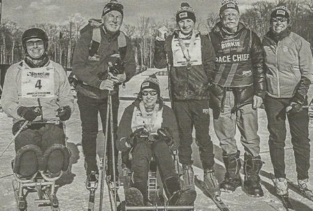 left) poses with other adaptive skiers, event sponsors and a race volunteer.