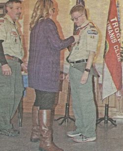badge, pinned to his uniform by his mother, Shelly (m), at the Eagle Scout Court