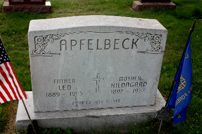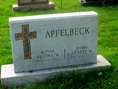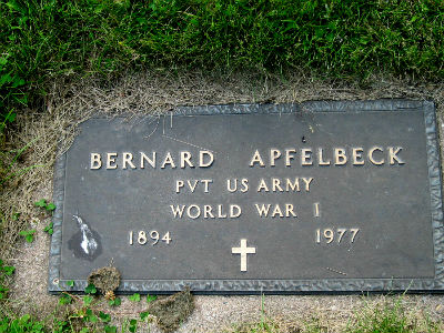 | to | Apfelbeck, Bernard A.; #2 | 11 May 1894 | 11 Jan 1977 | WWI-Pvt US Army | Bernadine Hoffman | 27 Nov 1923 | Joseph & Mary J. Apfelbeck? |