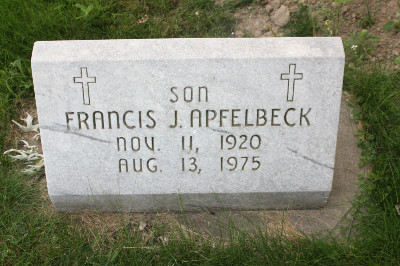| to | Apfelbeck, Francis J.; #2 | 11 Nov 1920 | 3 Aug 1975 | WWII-Cpl US Army | ? | Leo & Hildegarde (Ohlinger) Apfelbeck | |