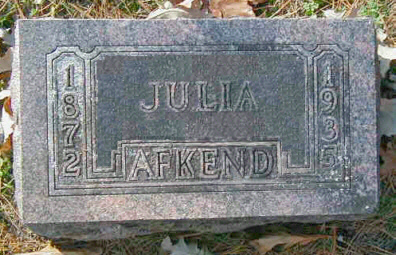 | to | Afkend, Julia Agusta | 07-D127-01 | 27 Jul 1872 | 24 Mar 1935 | Charles Afkend | 20 Jul 1904 | Gorrosa | b. near Rushmore, Nobles Co., MN & d. home |