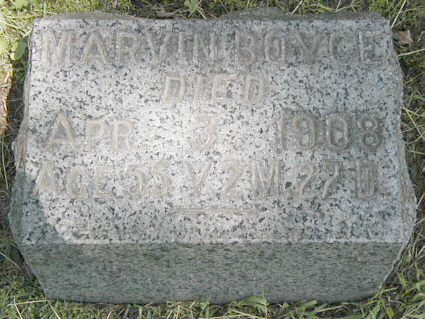 | tn | Boyce, Marvin | 12-D046-01 | 4 Jan 1853 | 3 Apr 1908 | Alansan Boyce & Unknown | b-est, aged 55yrs,2mo,27dys; b. Oswego Co., NY; Also spelled Bojc |