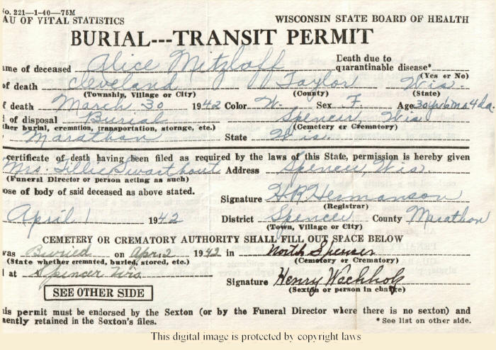 Mitzlaff, Alice Frances | 25 Sep 1911 | 30 Mar 1942 | Burial Permit |