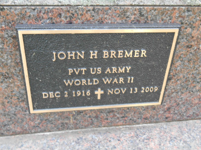 | ctofj | Bremer, John Henry; #2 | M/11/1-2 | 2 Dec 1916 | 13 Nov 2009 | WWII, Pvt US Army, 5th Cav; b. Mayville Clark Co., Wis. | Jean Amacher | 1 Jun 1945 | John & Pauline (Schneider) Bremer |