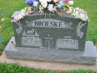 | toj | Broeske, Clyde L. | Q/9/6 | 21 Apr 1926 | 8 Jul 2007 | b. Mayville, Clark Co., Wis. | Carmen Schultz | 17 May 1947 | Elroy & Emma (Behring) Broeske |