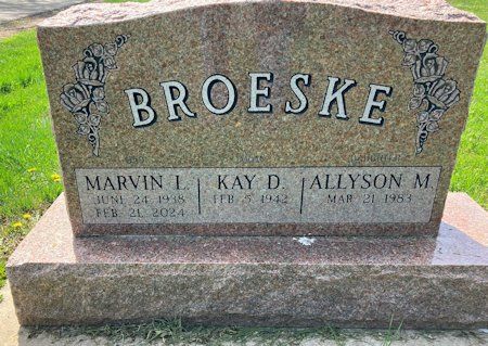 | j | Broeske, Marvin L. "Marv" | T/9/3 | 24-Jan-1938 | 21-Feb-2024 | b. Dorchester, Clark Co., Wis.; U.S. Army Vet; UWEC Grad | Kay Bobbe | 26-Jan-1961 | Elroy & Emma (Behring) Broeske |