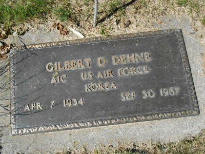 | tj | Dehne, Gilbert S. | G/1/4-6 | 7 Aug 1934 | 30 Sep 1987 | Korea-A1C US Air Force | Henry W. & Ida (Schultz) Dehne | ||