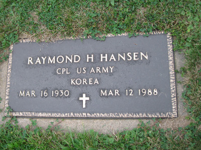 | tj | Hansen, Raymond H.; #2 | Q/14/6 | 16 Mar 1930 | 12 Mar 1988 | Korea-Cpl US Army | Marjorie C. Braun | 13 Mar 1954 | |