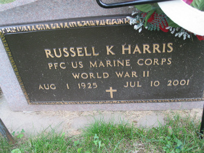 | tj | Harris, Russell K.; #2 | O/14/2-3 | 1 Aug 1925 | 1 Jul 2001 | b. La Farge, WI; WWII PFC US Marine Corps | Ruth L. Dunaway | ||