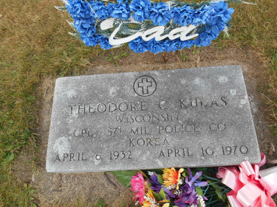 | ctoj | Kulas, Theodore G.; #2 | D/11/4-6 | 6 Apr 1932 | 10 Apr 1970 | b. Johnson, Marathon Co., WI; Korea-WI Cpl 571 Mil Police Co | Estella Kunze | 9 Jun 1951 | John & Rosa (Hiebl) Kulas |