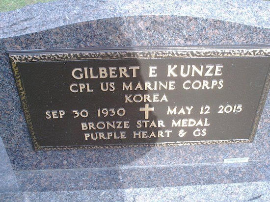 | ctoj | Kunze, Gilbert E. "Gib"; #2 | T/16/1 | 30 Sep 1930 | 12 May 2015 | b. Town of Hull, Marathon Co.; Korea, CPL, USMC, Bronze Star, Purple Heart | Joanne Weideman | 17 Jun 1961 | Joseph & Catherine (Meyer) Kunze |