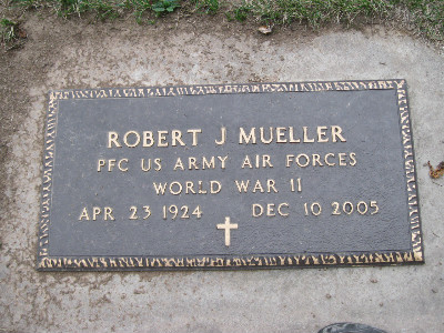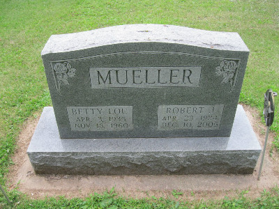 | ctoj | Mueller, Robert J.; #2 | O/9/2 | 23 Apr 1924 | 10 Dec 2005 | WWII-PFC US Army Air Force | Betty Lou Oehler | 18 Dec 1954 | John & Verena (Schlessel) Mueller |