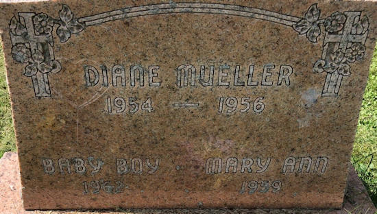 | toj | Mueller, Mary Ann | X/13/1 | 9 Jun 1959 | 10 Jun 1959 | Obit says Marianne | Alfred & Marie A. Mueller | ||