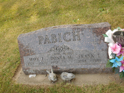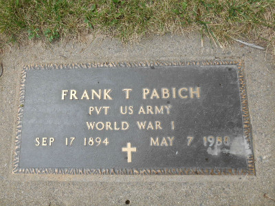 | ctx | Pabich, Frank T.; #2 | B/12/4-6 | 17 Sep 1894 | 7 May 1988 | WWI-Pvt US Army | Mary D. Hendzel | 21 Sep 1926 | Ignayz & Mary Pabich |