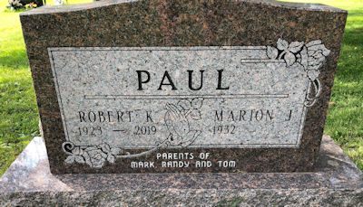 | ctoj | Paul, Robert K. | R/17/6 | 15 Jul 1923 | 20 Sep 2019 | b. Medford; WWII-WT2 US Navy | Marion Habermeyer | 14 Oct 1953 | Albert & Vernice (Raymond) Paul |
