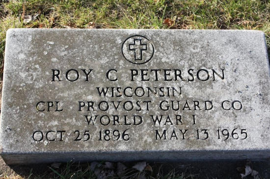 | ctoj | Peterson, Roy C. | I/2/1-3 | 25 Oct 1896 | 13 May 1965 | b. Preemption, IL; WWI-WI Cpl Provost Guard Co | Edna M. Adams | 8 May 1929 | Charles & Ella Christina (Johnson) Peterson |