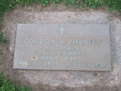 | ctxo | Phaneuf, Gordon J.; #2 | Q/7/4-6 | 21 Apr 1894 | 19 Jun 1970 | WWI-WI Eng I US Navy; b. Outagamie, Co., Wis. | Lila R. Parge | 2 Jul 1920 | Oscar & Marie Phaneuf |