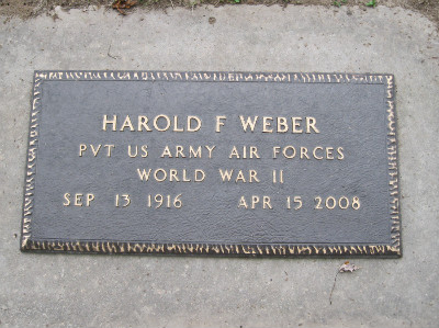 | tj | Weber, Harold F.; #2 | O/7/2 | 13 Sep 1916 | 15 Apr 2008 | b. Bruno, Saskatchwan; WWII-US Army | Single | Fred & Mary Weber | |