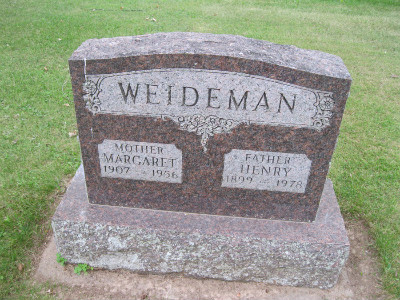 | ctxoj | Weideman, Margaret | M/2/1-3 | 21 Jan 1907 | 14 Apr 1956 | b. Jackson Co., Wis.; Grade school teacher; Hit by auto | Henry Weideman | 16 May 1936 | James & Lydia (Whitman) Melvin |