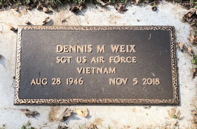| ctoj | Weix, Dennis M. | L/11/1-2 | 28 Aug 1946 | 5 Nov 2018 | b. Wisconsin; Vietnam, USAF- Sgt USAF | Sheila ? | Henry & Mary (Downer) Weix | |
