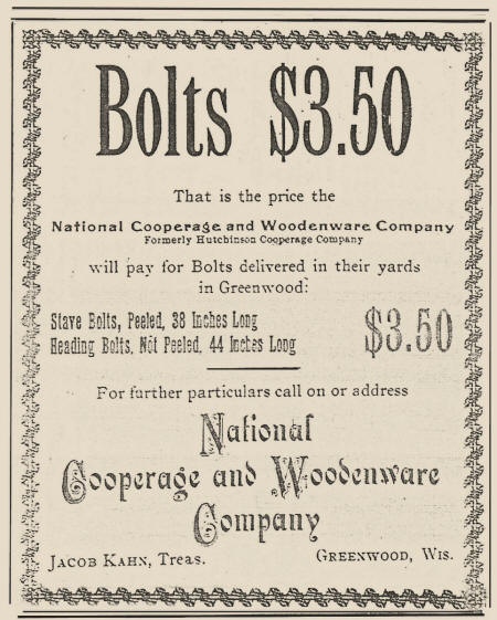 Jacob Kahn married Rosa who was nicknamed "Rosie" in 1876 when she was eighteen years old. They had three sons, Edgar, Ira and Walter. Jacob was a long time employee of the National Cooperage and Woodenware Company. He was the treasurer of that company in Greenwood, Wisconsin in 1900 as is evidenced by the advertisement above.
