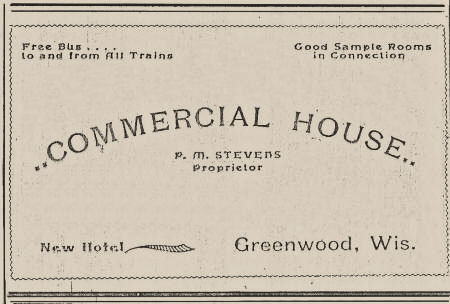 Peter M. Stevens was the forty-eight year old proprietor of the "Commercial House" hotel featured in the advertisement above. He was one of Greenwood's earliest pioneers, having moved to the area when it was only sparsely populated. March 9, 1900, Ed. McLaughlin and wife of Fairchild met at the Commercial House with Mr. Stevens and rented the hotel and took charge of it about the first of May, 1900, when Mr. Stevens moved back to his own property.