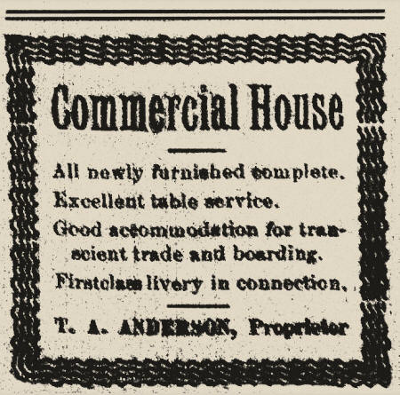 The Commercial House has been rented by C. E. Thorpe, who will take charge of it in a week or so. Mrs. Thorpe is a No. 1 cook and housekeeper and with the help of an uncle and sister of Mr. Thorpe they will be prepared to take care of the homeless and wayfaring in homelike style and comfort. 18 Oct 1901.