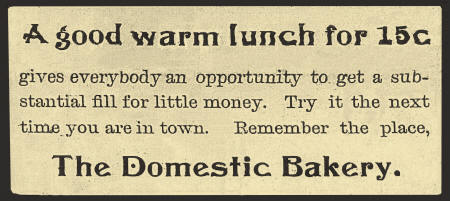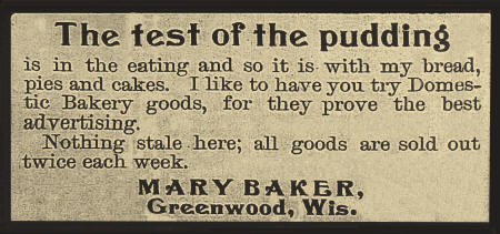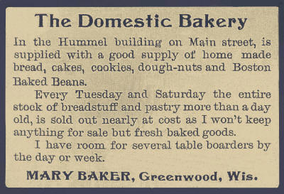 --As will be noted in Miss Baker's advertisement she is hustling for business and is taking up-to-date methods to secure the same, by the use of printer's ink. Her bakery is well equipped and is kept in apple-pie order. The oven with which she does her baking is a large one built for the purpose and does excellent work. Miss Baker (remainder cut-off). 14 Aug 1902.