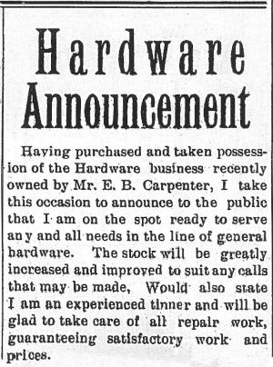 Edgar B. Carpenter was listed as a Hardware dealer in the 1900 census for Eaton, Clark Co., Wisconsin.