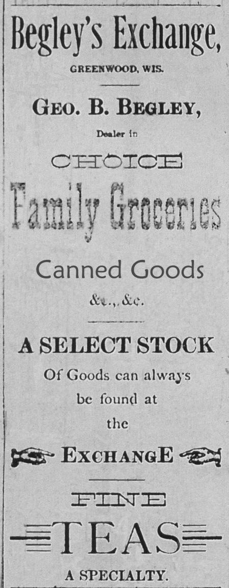 The Advertisement above appeared in "The Neillsville Times" during 1882 and featured George B. Begley's Grocery Store in Greenwood, Eaton Twp., Clark Co., Wisconsin. |
