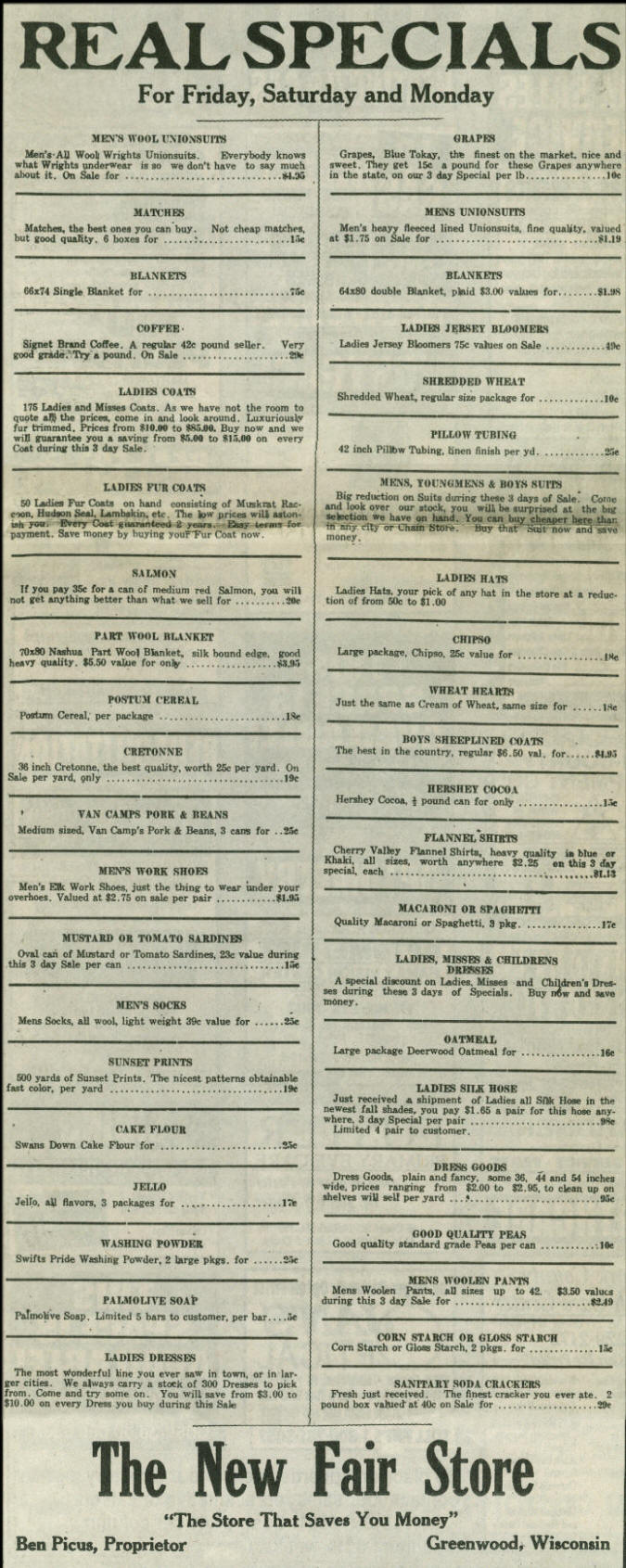 In 1870 "Chandler and Brown" of Black River Falls rented Honeywell's store for one year and then built and moved into a building on the lot where the Picus store was situated when this advertisement ran in 1929. Ben Picus rented the building from J. Arends and conducted a General Store there with Billie Rellis as manager. Although not the original store, it was on the site of the first building. For several years, Leroy Ramsey ran a mercantile business in Greenwood, but later sold his store to Ben Picus.