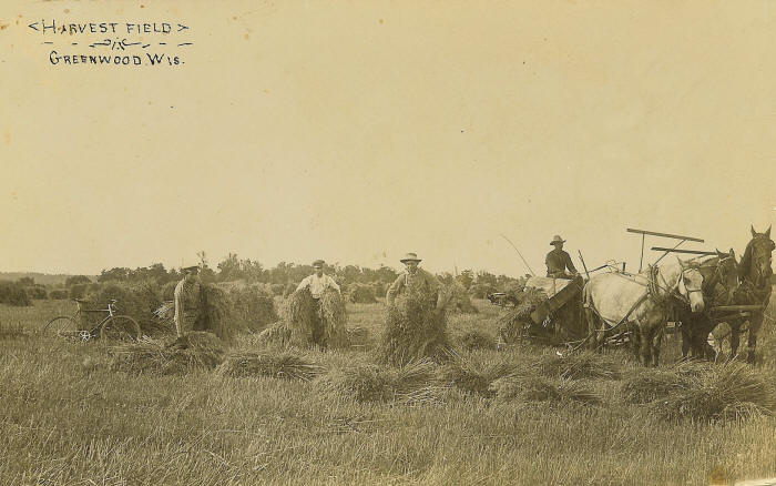 Above--1906 Post Card Photo of Local Farmers Shocking Oats near Greenwood, Wisconsin.